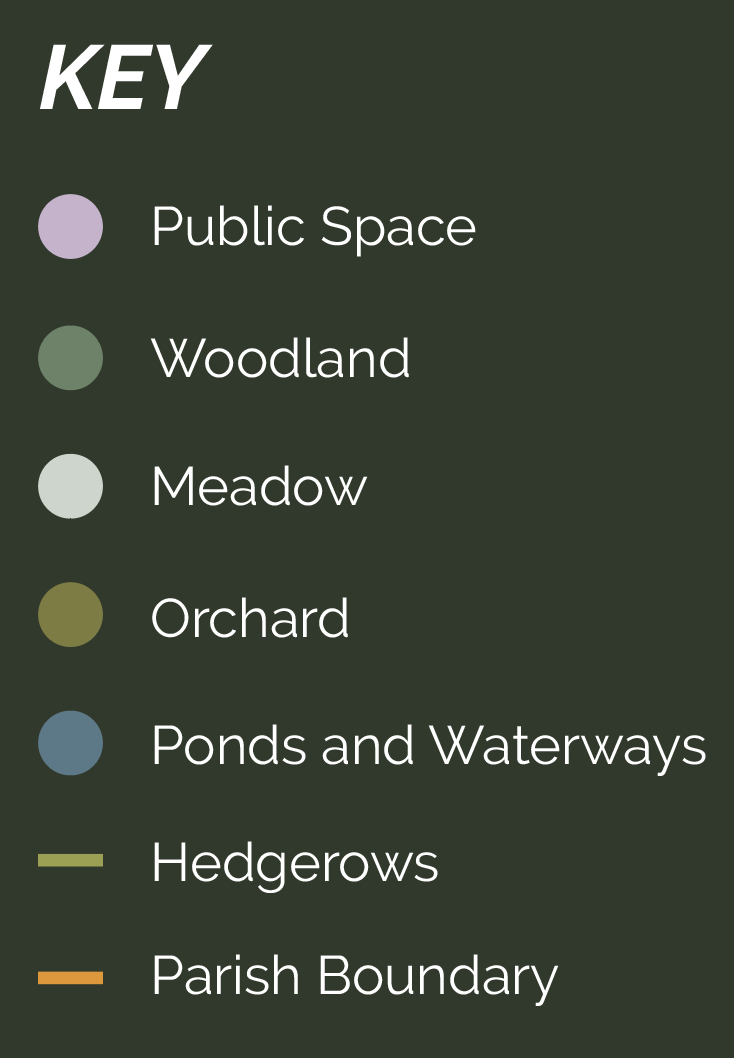 The above identifies existing habitats that we have mapped in the village. It will be an evolving map and updated regularly based on new records being submitted and through the local community working group carrying out positive management of the land within the parish.